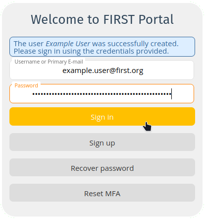You can sign-in to FIRST Portal using either your primary email address or your FIRST username. If you just created your profile, you will need to create a username, so you should use the email.