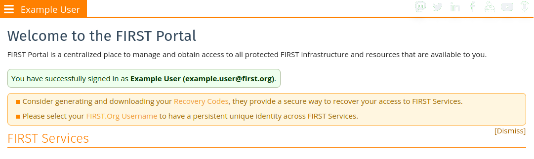 After a successful sign-in, you will see the FIRST Portal home page, where you will find the services and actions available for your profile.